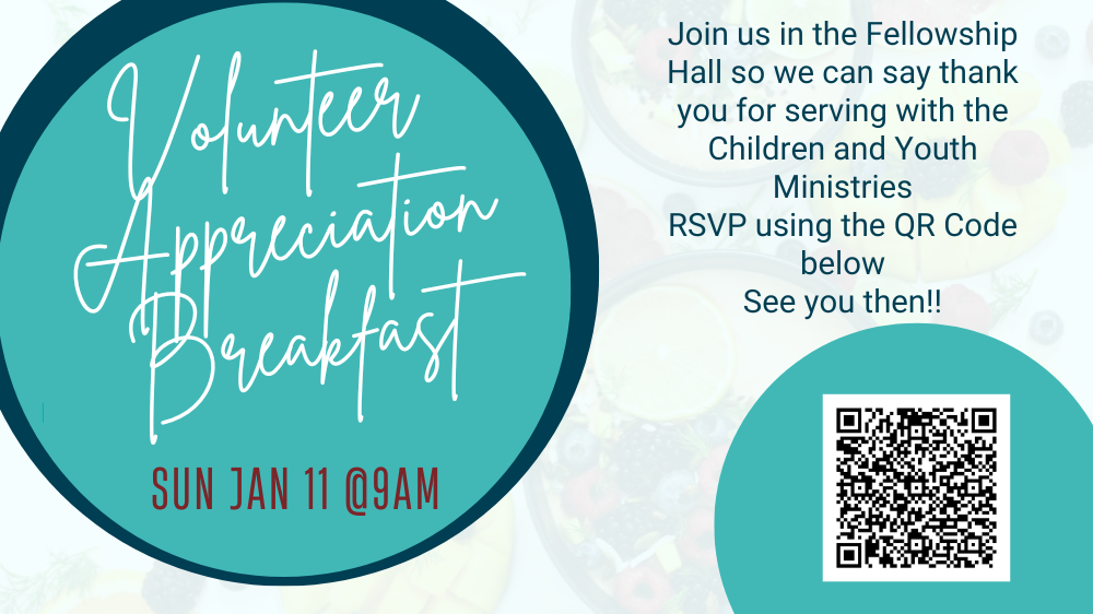 All volunteers of children and youth are invited to enjoy breakfast before ...Kids & Youth Volunteer Appreciation BreakfastSunday, January 11, 2026, 9:00 AM - 10:00 AM